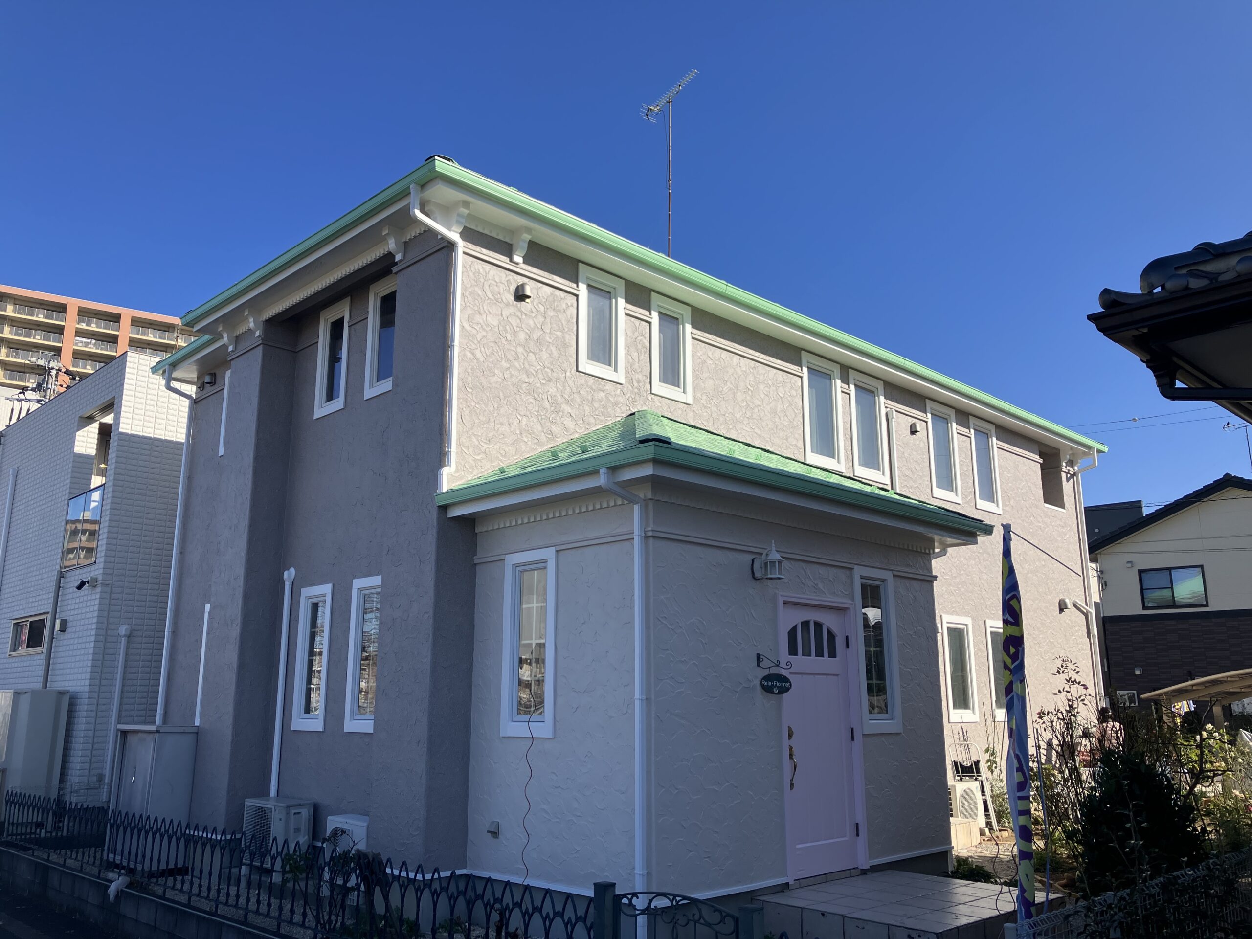 つくばみらい市つくばみらい市 M様邸 外壁屋根塗装工事を行いました施工後 施工前 工事の概要築年数16年外壁素材モノプラル外壁屋根素材アスファルトシングル外壁塗料シリコン系遮熱屋根塗料無機フッ素カラーグリーン、ピンクグレー施工内容外壁屋根、付帯部塗装施工の様子 茨城町 M様邸 外壁屋根塗装工事